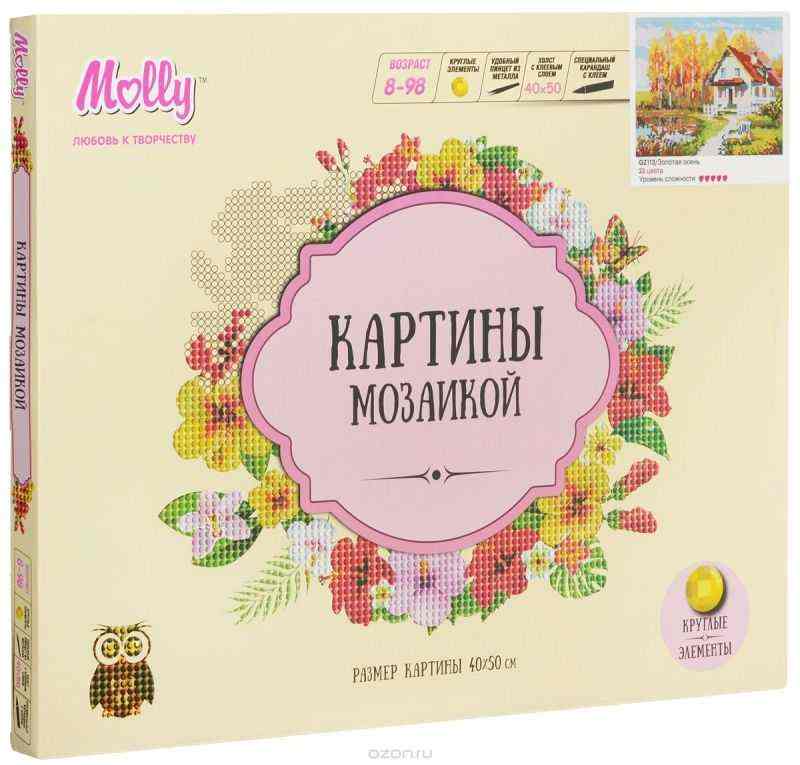 Картины мозаикой "Molly" - вид творчества и увлекательное времяпровождение, которое позволяет без специальной подготовки любому желающему создать яркую, переливающуюся всеми цветами радуги картину. Неоспоримым преимуществом такого вида творчества является то, что для создания потрясающей картины, по уровню мастерства не уступающей профессиональной, не требуется специальной подготовки.Мозаичные картины - не что иное, как эскиз будущего рисунка, контур, нанесенный на холст. Рисунок разбит на маркированные буквой или цифрой сегменты. Каждой цифре или букве соответствует определенный цвет мозаики.Благодаря качественной шлифовке мозаичных элементов любая готовая картина выглядит просто потрясающе. Специальный пинцет в наборе и клеевая основа холста позволяют удобно, без использования дополнительных инструментов распределять мозаичные элементы на холсте.Картина мозаикой Molly "Золотая осень" красиво выглядит при любом освещении. Готовая картина с изображением осеннего пейзажа прекрасно дополнит любой интерьер и станет отличным подарком каждому.