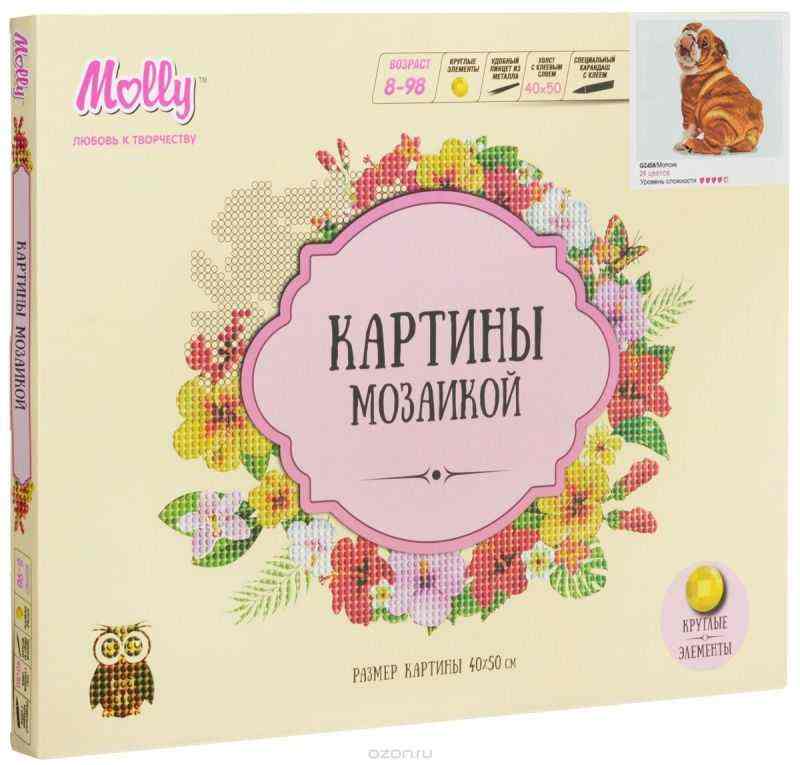 Картины мозаикой "Molly" - вид творчества и увлекательное времяпровождение, которое позволяет без специальной подготовки любому желающему создать яркую, переливающуюся всеми цветами радуги картину. Неоспоримым преимуществом такого вида творчества является то, что для создания потрясающей картины, по уровню мастерства не уступающей профессиональной, не требуется специальной подготовки.Мозаичные картины - не что иное, как эскиз будущего рисунка, контур, нанесенный на холст. Рисунок разбит на маркированные буквой или цифрой сегменты. Каждой цифре или букве соответствует определенный цвет мозаики.Благодаря качественной шлифовке мозаичных элементов любая готовая картина выглядит просто потрясающе. Специальный пинцет в наборе и клеевая основа холста позволяют удобно, без использования дополнительных инструментов распределять мозаичные элементы на холсте.Картина мозаикой Molly "Мопсик" красиво выглядит при любом освещении. Готовая картина с изображением очаровательной собачки - прекрасное украшение любого помещения и отличный подарок родным и близким.