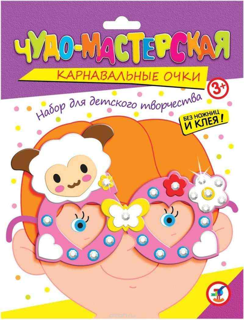 Не знаете, как превратить обычный детский праздник в весёлый карнавал? Сделайте вместе с детьми оригинальные карнавальные очки. Для этого вам не понадобятся ни ножницы, ни клей. Всё что нужно для работы есть в наборе. Каждый ребёнок может выбрать очки по своему вкусу: 14 вариантов оформления - есть из чего выбирать! Возьмите пластмассовые очки, наклейте на них детали из мягкого пластика на самоклеящейся основе, украсьте стразами - и очки готовы! В комплекте: пластиковые очки, детали из мягкого пластика ЭВА, стразы, два кольца двустороннего скотча, листовка-образец