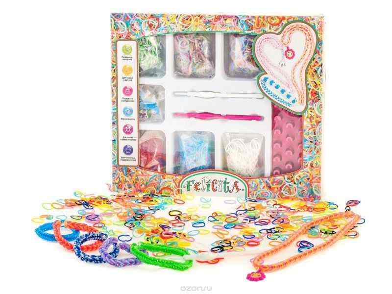 Набор для плетения из резиночек "Felicita" - это развивающая игра, увлекательное хобби и именно тот подарок, который нужен вашему ребенку!Это набор для творчества, помогающий развить моторику, воображение и навык сочетать различные цвета. При помощи данного набора дети и взрослые смогут не только погрузиться в волшебный мир рукоделия, но и подарить себе, своим близким и друзьям оригинальные украшения, изготовленные своими руками из маленьких ярких резиновых колечек. Яркие украшения из разноцветных резинок - это прекрасный способ проявить индивидуальность, талант и умение.В состав набора входят все необходимые инструменты для плетения: большой мега-набор резиночек разных цветов, рисунков и оттенков, набор S-образных клипс, 2 крючка, 2 удобных станка для плетения, соединяющихся между собой для плетения длинных изделий, набор дополнительных украшений и подробная инструкция на русском языке. Изучив основы, ребенок сможет самостоятельно придумывать оригинальные композиции, создавать уникальные игрушки и образы.Все детали набора изготовлены из высококачественных материалов и совершенно безопасны для детей.