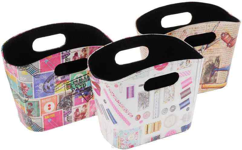 Контейнер для хранения мелкой фурнитуры "Hemline" выполнен из искусственной кожи и ПВХ. Внешние стенки изделия декорированы красочным рисунком. В таком контейнере удобно хранить различные предметы для рукоделия. Яркий и необычный дизайн придется по вкусу любой мастерице. Для удобства переноски сверху имеются ручки. Размер контейнера: 18,5 х 15,5 х 8,5 см. Комплектация: 3 шт.