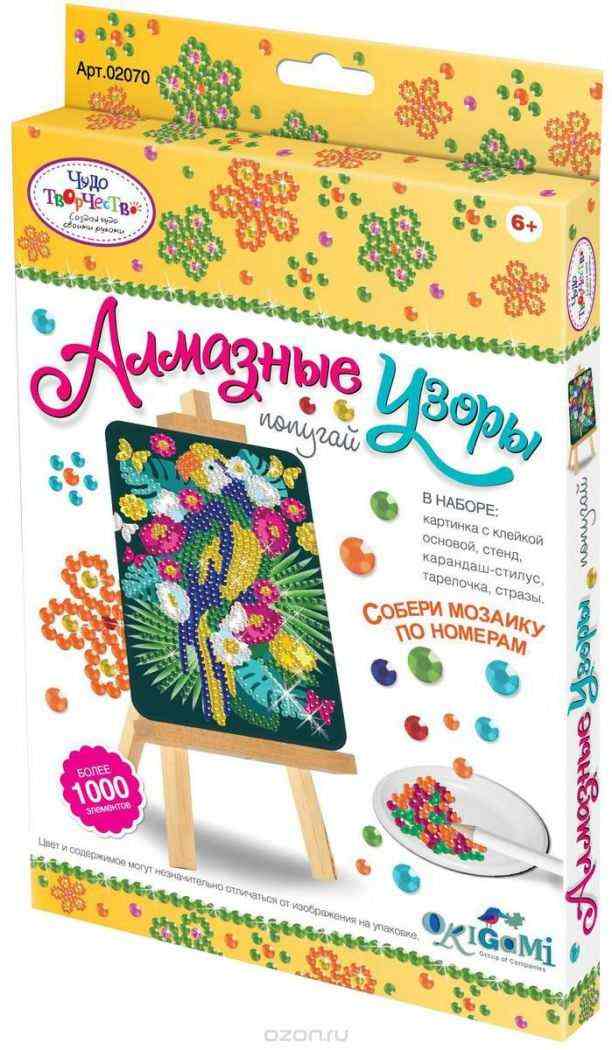 Картина мозаикой Чудо-творчество "Попугай" - вид творчества и увлекательное времяпровождение, которое позволит ребенку без труда создать яркую картину из мозаики с изображением яркого попугая. В комплект входит все необходимое для создания собственного шедевра: разноцветные элементы мозаики, подставка-мольберт, стилус, тарелочка для мозаики и основа с клеевым слоем, на которую уже нанесен рисунок. Собрать мозаику просто: необходимо взять картинку, снять защитный слой, насыпать в тарелочку по очереди разные цвета страз и с помощью специального карандаша перенести стразы на клейкую основу по номеру и цвету. Готовую мозаику можно поставить на мольберт (входит в набор).Картина мозаикой, созданная своими руками, станет превосходным украшением детской комнаты, а также послужит замечательным подарком родным и близким.