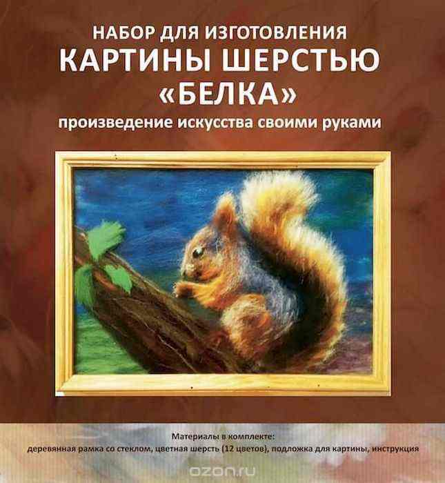 В набор Цветной "Белка" входит все необходимое: - шерсть натуральная (12 цветов); - подложка; - рамка деревянная со стеклом; - подробная инструкция. С таким набором получается объемная, необыкновенная картина с 3D эффектом.