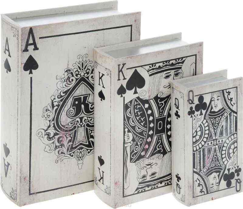 Набор "Bestex" состоит из трех шкатулок, стилизованных под книги. Шкатулки, изготовленные из МДФ, оформлены изображениями мастей карт. Внутри шкатулки обтянуты тканью. Закрываются шкатулки на магниты. Изящные шкатулки с ярким дизайном предназначены для хранения мелочей, принадлежностей для шитья и творчества и других аксессуаров. Такой набор красиво оформит интерьер комнаты и поможет хранить ваши вещи в порядке, а также станет отличным подарком. Размер маленькой шкатулки: 12,5 х 22,5 х 5 см. Размер средней шкатулки: 20 х 28,5 х 6,8 см. Размер большой шкатулки: 25,5 х 34 х 8,5 см.