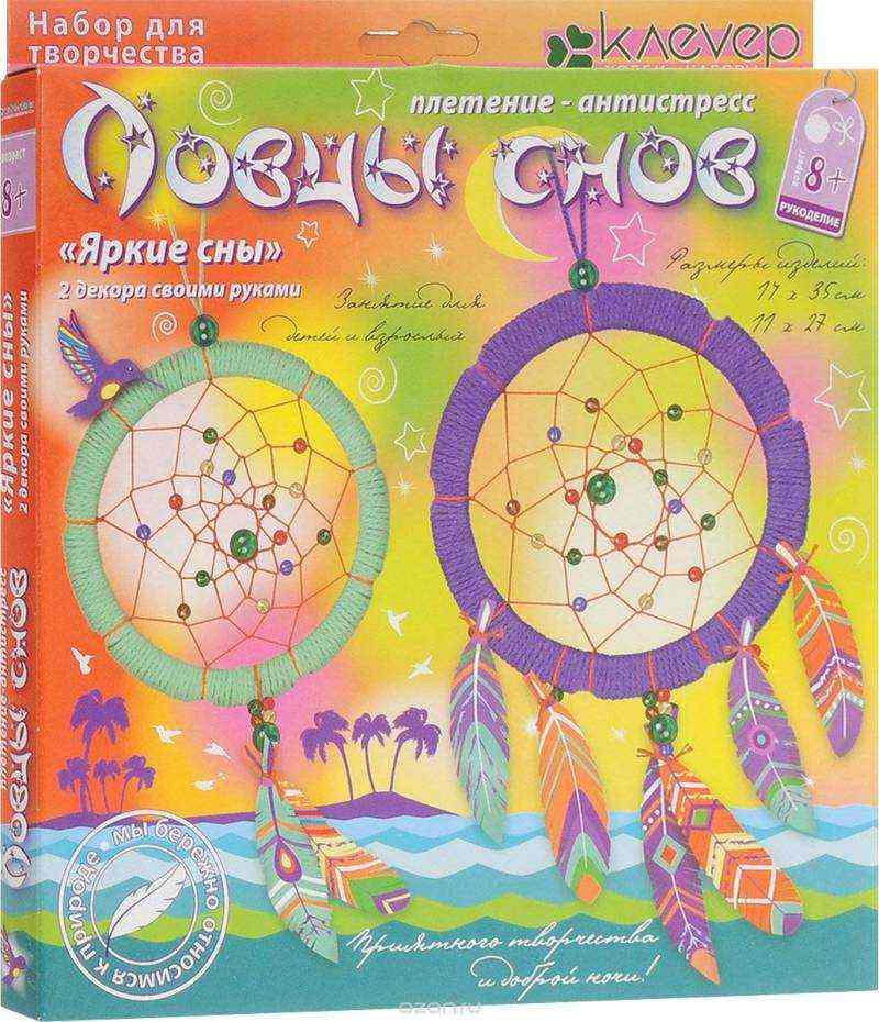 Набор для изготовления ловца снов Клевер "Яркие сны" - изделие в натуральном цвете из пряжи, нитей, бусин и бумаги.Индейские легенды гласят: если повесить "ловца" у изголовья кровати, то он будет пропускать только хорошие и добрые сны, а плохие и злые - задерживать в своей паутинке. Плетение "ловца" успокаивает и снимает стресс. Для облегчения создания этого чуда, производители придумали круг с выемками для намотки нитей, подобрали интересные цветовые сочетания разных материалов. В наборе нет настоящих перьев, вместо них предлагаются пестрые декоративные перья из бумаги!Красивые натуральные цвета пряжи и бумажных перьев этого набора придадут готовым изделиям этнический вид, сделают их изюминкой интерьера. Вы можете сделать сразу двух "ловцов" из одного набора! Плетите вместе с мамой или с друзьями, себе и в подарок!