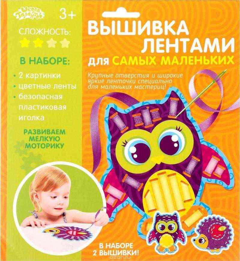 Вышивка лентами - творческое занятие, которое направлено на развитие мелкой моторики у детей. Ребёнку предстоит продевать ленты через специальные отверстия на картонных заготовках. Делать это предстоит с помощью безопасной пластиковой иглы из комплекта и в определенной последовательности, чтобы соблюсти рисунок или украсить персонажа. У данных развивающих наборов от Школы талантов есть 2 варианта сложности, что позволит сделать занятия с ними увлекательнее, когда малыш освоит более простую вышивку.