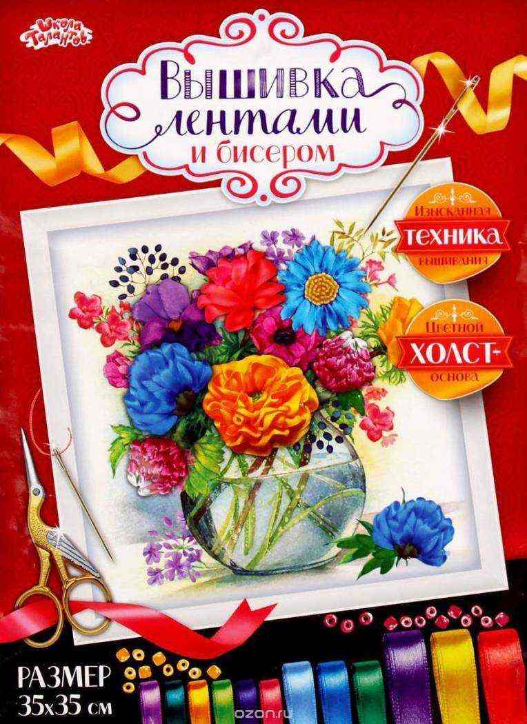 Вышивка лентами — один из древнейших видов рукоделия. Возрастающий в последние годы интерес вернул моду на это творчество. Технология включает в себя более 15 основных видов стежка, благодаря комбинациям которых воплощаются в жизнь самые разные мотивы. Схема показывает процесс нанесения разметки лент на ткани, а также основные техники вышивки до оформления готовой работы. Сочетание лент и бисера придаёт шедевру ещё больший объём и выразительность. Трудно устоять перед искушением создать такую удивительную вышивку самостоятельно. Полезные советы Необходимые инструменты для работы над подобной вышивкой — ножницы и зажигалка. Так как лента после среза начинает пушиться, её конец нужно немного опалить. Но только тот край, который будет с узелком на конце. Если опалить край возле иглы, то лента либо не пройдет через ткань, либо будет портить основу. Создавайте объёмные цветочные узоры из лент: украшайте повседневную и праздничную одежду и аксессуары; декорируйте предметы интерьера; мастерите невероятные живые картины. В набор входит: цветной холст-основа, 2 иголки, цветные ленты, нити мулине, бисер, схема. Готовая картина из лент и бисера станет замечательным подарком для родных и близких или оригинальным украшением интерьера!