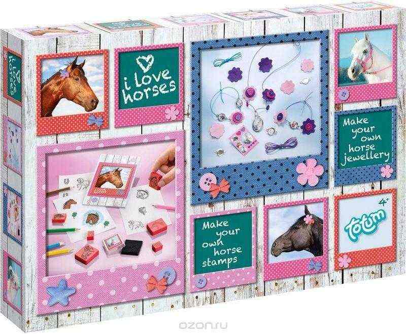 Набор "I love horses" от Totum понравится вашему ребенку и доставит радость от игры. Прекрасно развивает мелкую моторику, творческий подход. Штампы, входящие в комплект подойдут для украшения открыток, панно, сделанных своими руками. В набор входят: блокнот, 6 печатей, 5 карандашей, чернила, подушечка для чернил, 2 войлочных цветка, 2 эластичных шнурка в 2 цветах и различная фурнитура для создания бижутерии.