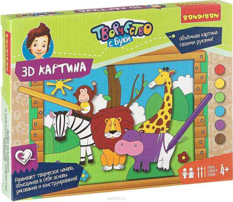 Набор для создания 3D картины Животные развивает творческое начало, объединяя в себе основы и рисования, и конструирования. В набор входят листы для раскрашивания и фломастеры. Создание объемной картины - очень увлекательный процесс, который обязательно понравится вашему ребенку! С помощью многоуровневых изображений создается тот самый эффект объема. Их предстоит собрать воедино и разукрасить!