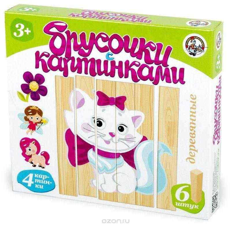 Деревянные брусочки с картинками Маленькая принцесса являются одной из эффективных развивающих игрушек для малышей от 3 лет. Как приятно из разных на первый взгляд непонятных частей получить интересные картинки. Правильно складывая деревянные брусочки, ребенок сможет собрать 4 тематические картинки: маленькую принцессу, котенка, пони и цветок. Это увлекательное занятие развивает память и образное мышление. В каждом наборе содержится 6 деревянных брусочков размером 143 х 22 х 22 мм. Картинки на них нанесены безопасными красками, не имеющими запаха.