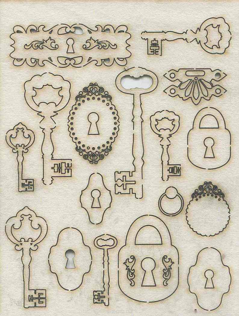 Чипборд "Замочные скважины, ключи, замки" изготовлен из плотного картона. Его отличие от простого картона в толщине и в том, что он ломается при сгибании. Элементы в виде ключей, замков и замочных скважин (17 штук) предназначены для дальнейшего декорирования. Чипборд активно используется в технике скрапбукинг для украшения скрап-страничек, фотоальбомов, блокнотов, дневников и т.д., а также для оформления подарочных коробок и конвертов.