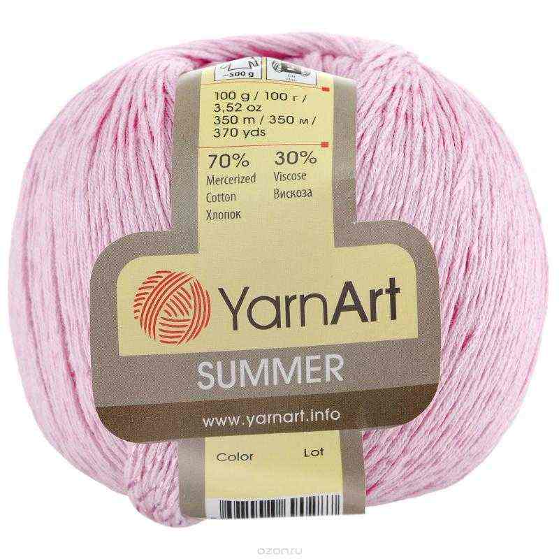 Пряжа YarnArt "Summer" - классическая пряжа для вязания, которая идеально подходит для летнего гардероба, ажурных изделий. Нить средней толщины, структура состоит из хлопковой нити, оплетенной шелковистой вискозной. Скрутка плотная, не раздваивается в процессе вязания, не перекручивается, работать с такой пряжей комфортно. Готовое полотно не косит в процессе работы. Стоит обратить внимание, что крупные ажуры могут немного вытягиваться под собственным весом. Рекомендуется связать образец прежде, чем вязать изделие. Однако готовое изделие превосходно в носке. Палантины, пончо, юбки красиво драпируются. YarnArt "Summer" - замечательная летняя пряжа для взрослых и детей. Можно вязать спицами и крючком платья, панамы, кофты, топы, жилеты, юбки, сарафаны, джемпера, изысканные шали и палантины, а также создавать аксессуары, например, сумочки. Рекомендованы для вязания крючки и спицы 3-3,5 мм. Состав: 70% хлопок, 30% вискоза.