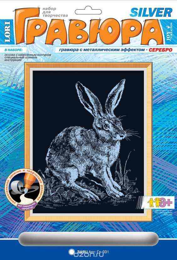 Гравюра "Заяц" с металлическим эффектом "под серебро" содержит в комплекте основу с нанесенным контуром, специальный штихель и инструкцию. Контур изображения зайца уже нанесен на черный фон. С помощью специального штихеля изображение процарапывается по контуру, и из-под слоя краски появляется блестящая серебристая основа. В результате получается контрастный рисунок с эффектным изображением. Несложный и занимательный процесс создания гравюры принесет удовольствие ребенку, поможет развить творческие способности, фантазию и внимательность, а получившееся изображение станет достойным украшением интерьера или подарком на любой праздник.